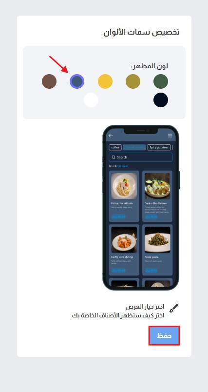 بمجرد الانتهاء من اختيار الألوان والثيم المناسب لهوية متجرك ، اضغط على زر "حفظ " لتطبيق التعديلات على قائمتك.