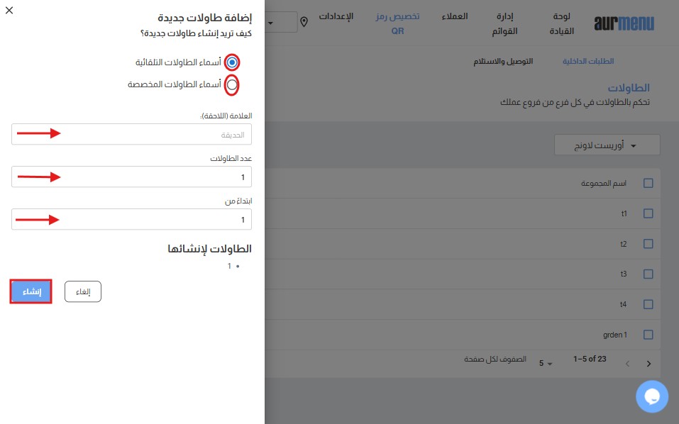 ✔ أدخل أسماء الطاولات وعددها، ثم اضغط على "إنشاء" لحفظ التغييرات.