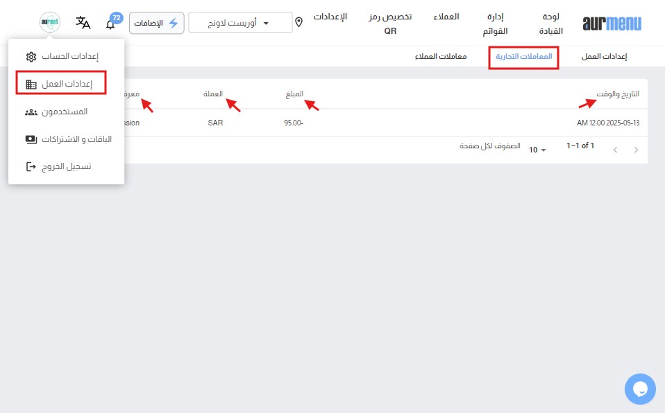 يتيح قسم المعاملات التجارية متابعة جميع العمليات المالية التي تمت بين أورمينيو وصاحب المتجر أو المنشأة، مع عرض تفاصيل كل معاملة.
