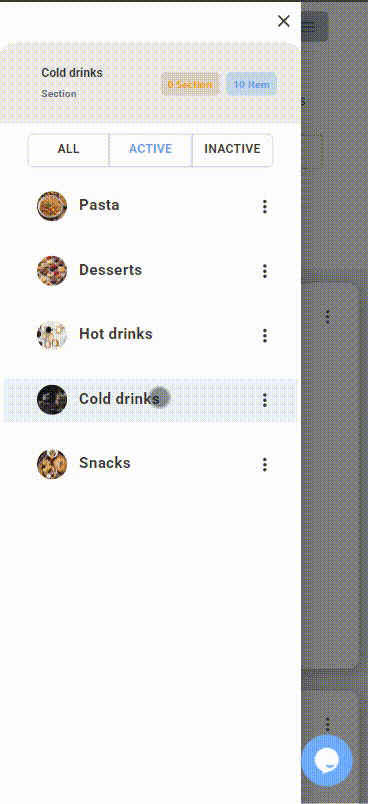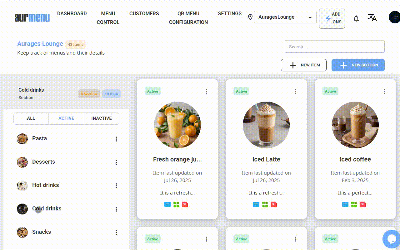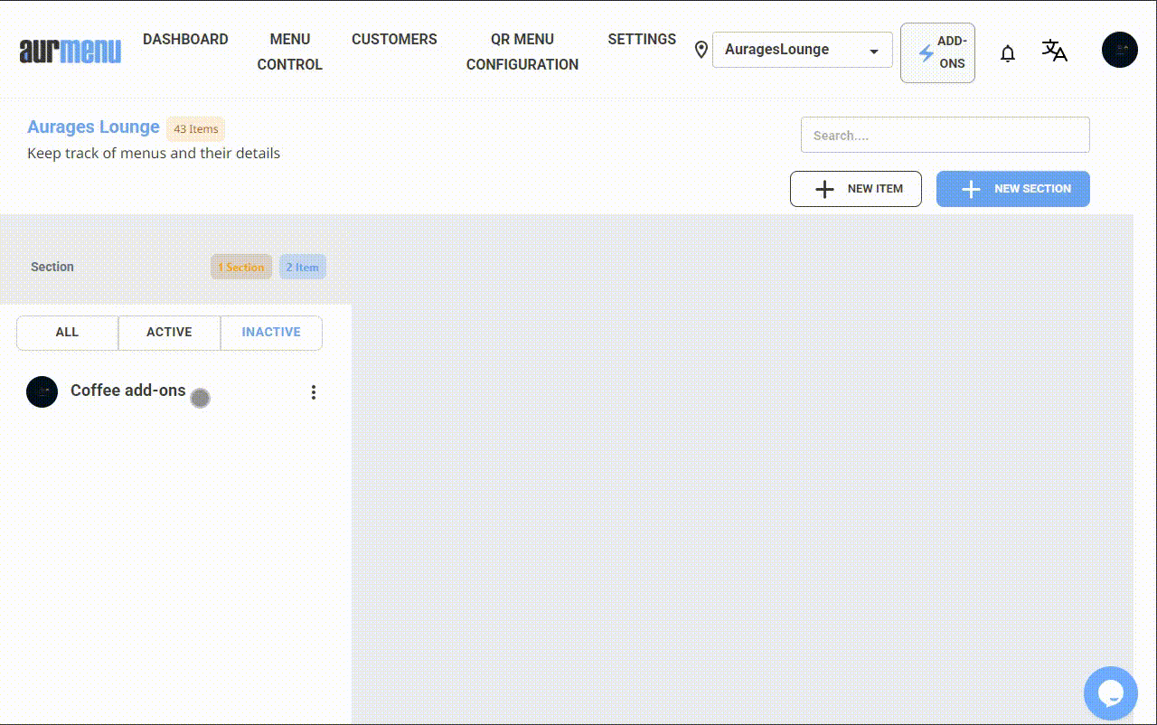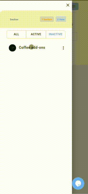 From the menu containing the item (e.g., Iced Latte), create a new section for paid add-ons (e.g., Caramel – 10 SAR) and set the section to Inactive.