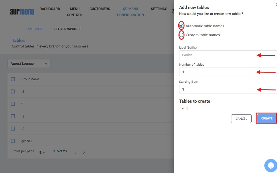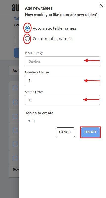 ✔ Enter the table names and quantity, then click "Create" to save the changes.
