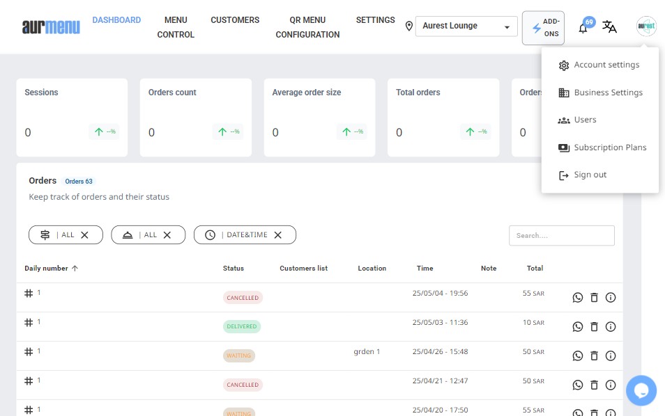 The Dashboard in Aurmenu is the main interface that provides you with a comprehensive view of your store’s performance and allows you to manage all tools easily.