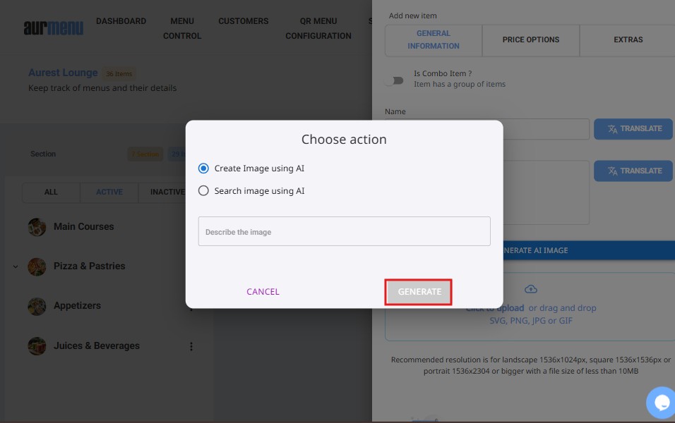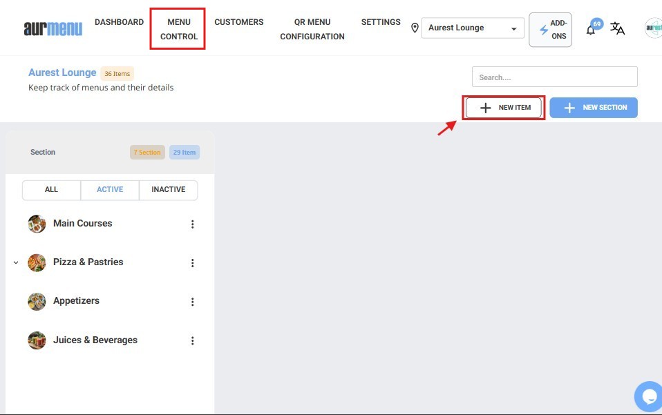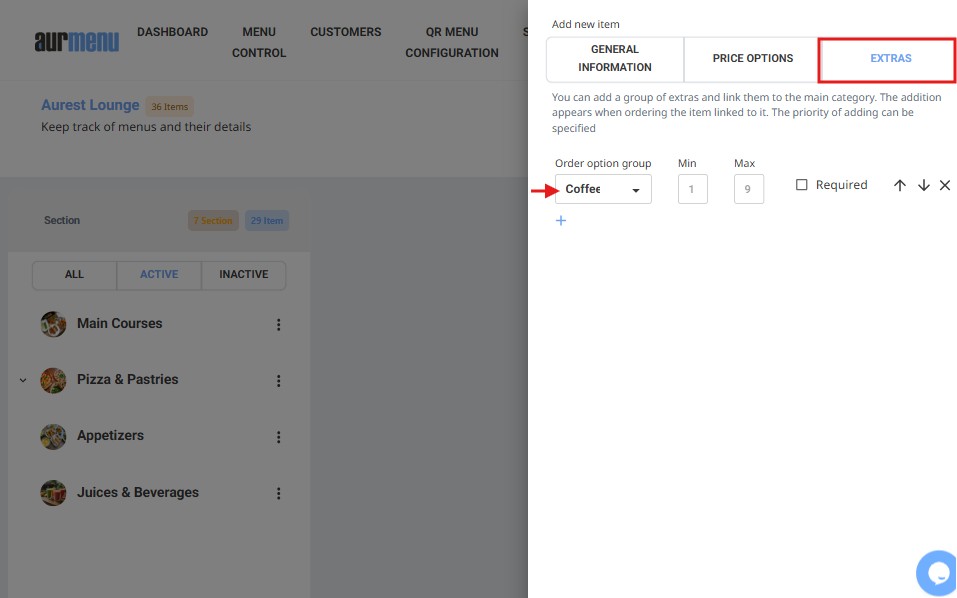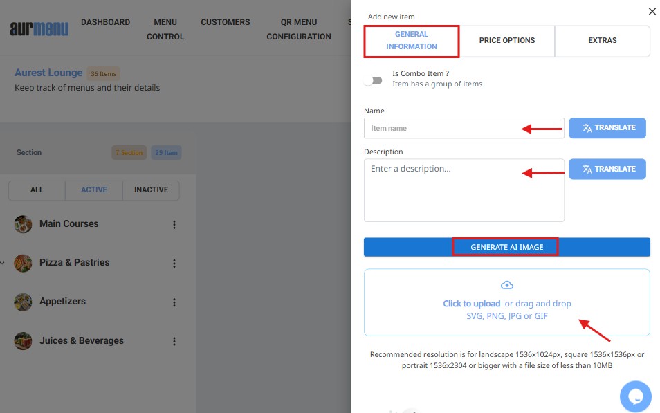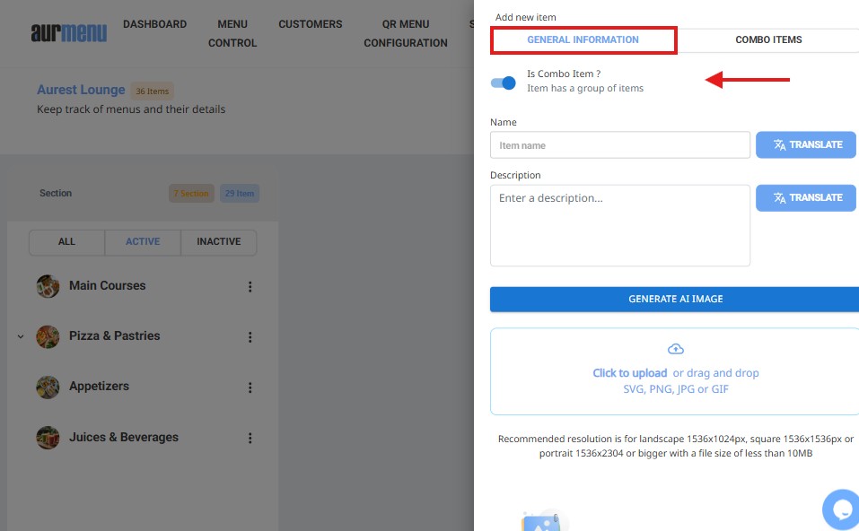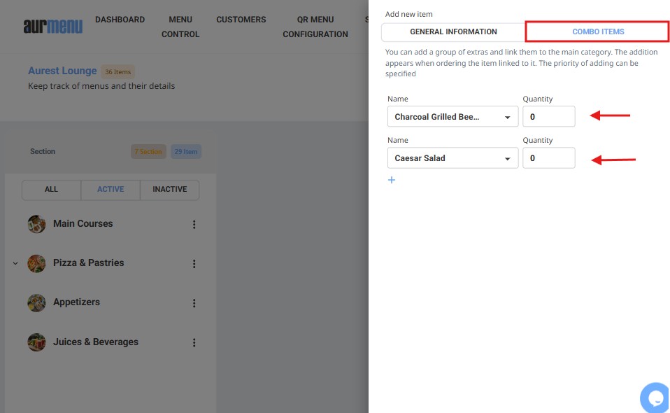 Adding a new item to the menu in Aurmenu allows for organizing content, setting prices, and configuring add-ons and combo options according to the required settings. This guide explains the steps for entering items and customizing their details accurately.