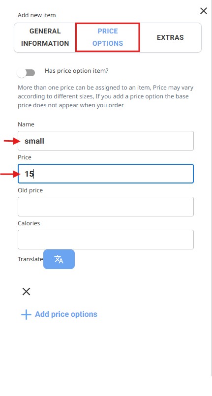 Create different sizes or portions for the item with separate prices.