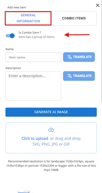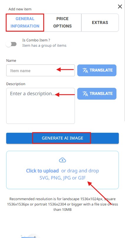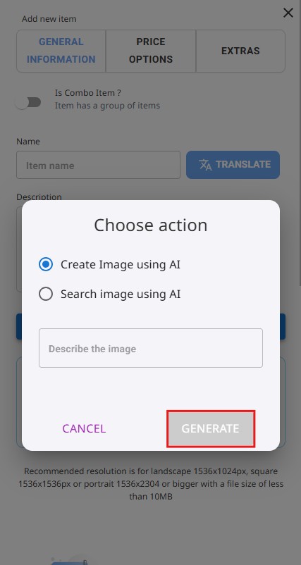 You can either manually upload an image or generate one using AI, which selects a suitable image based on the item description.