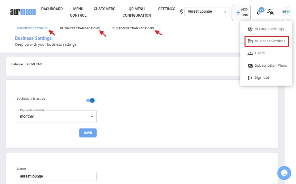 This section displays all financial transactions made between Aurmenu and your business.